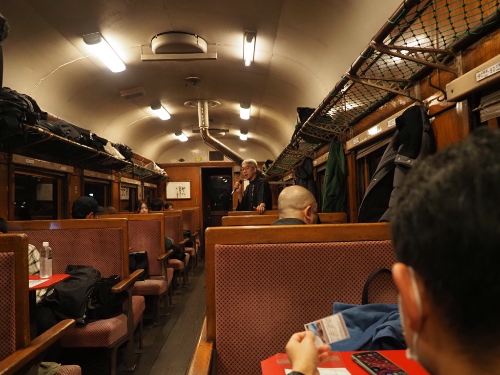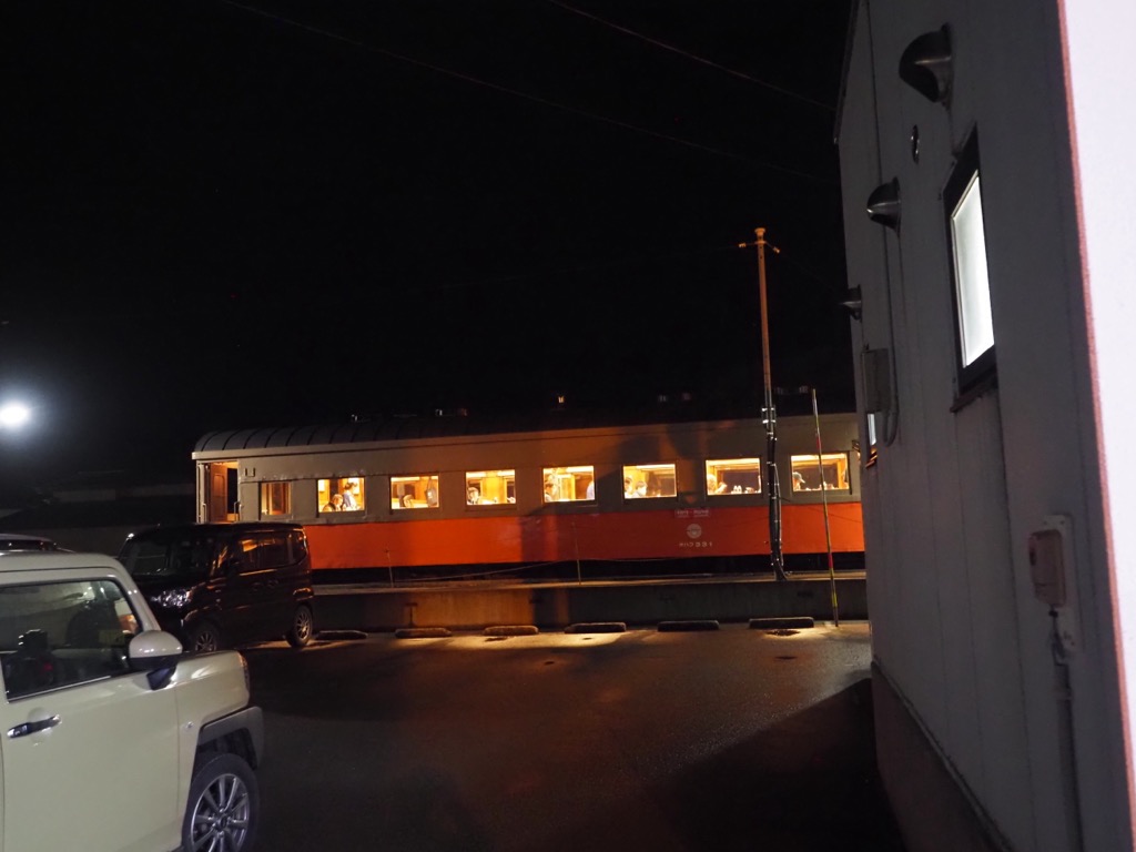 窓の外は真っ暗たまに遠くに灯りが見える程度、それに反して車内は賑やかに笑い声が響いています。まるで特別な時間の中にいるような錯覚を覚えます。