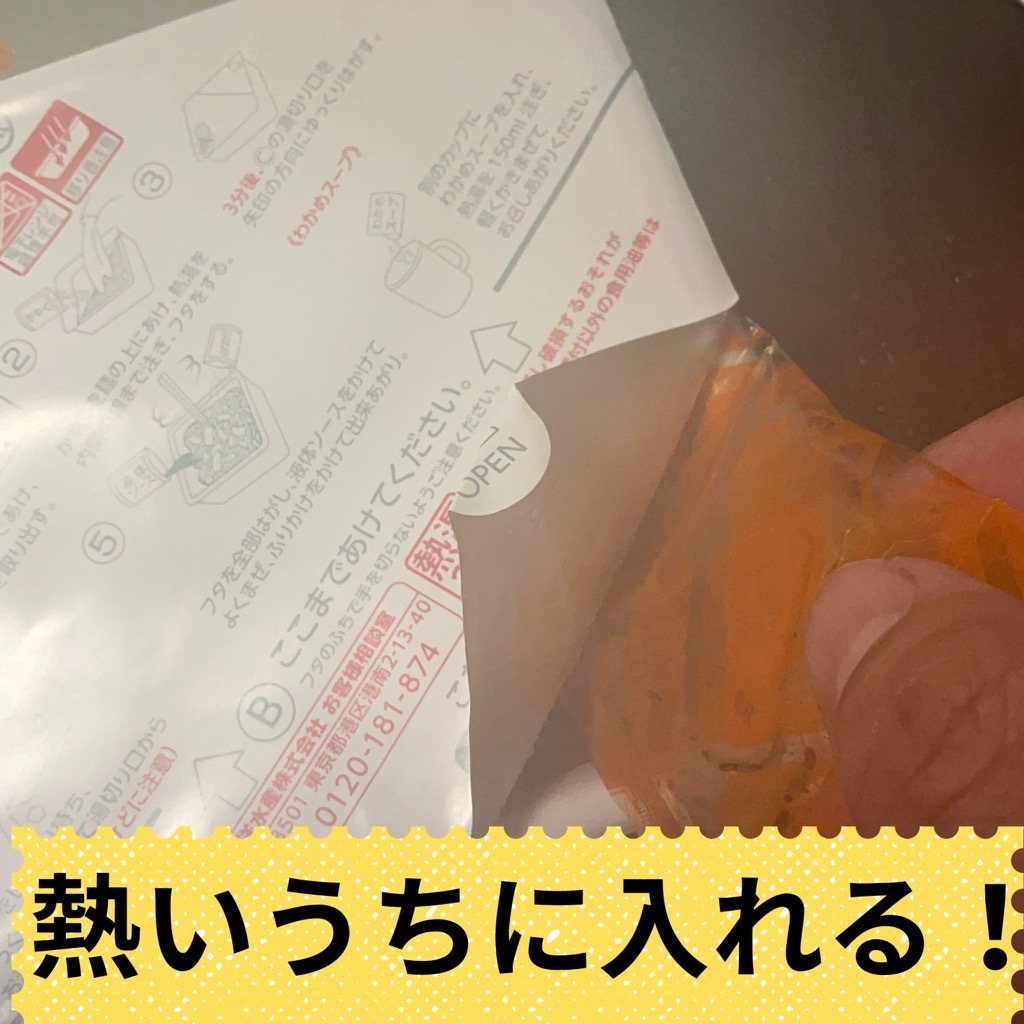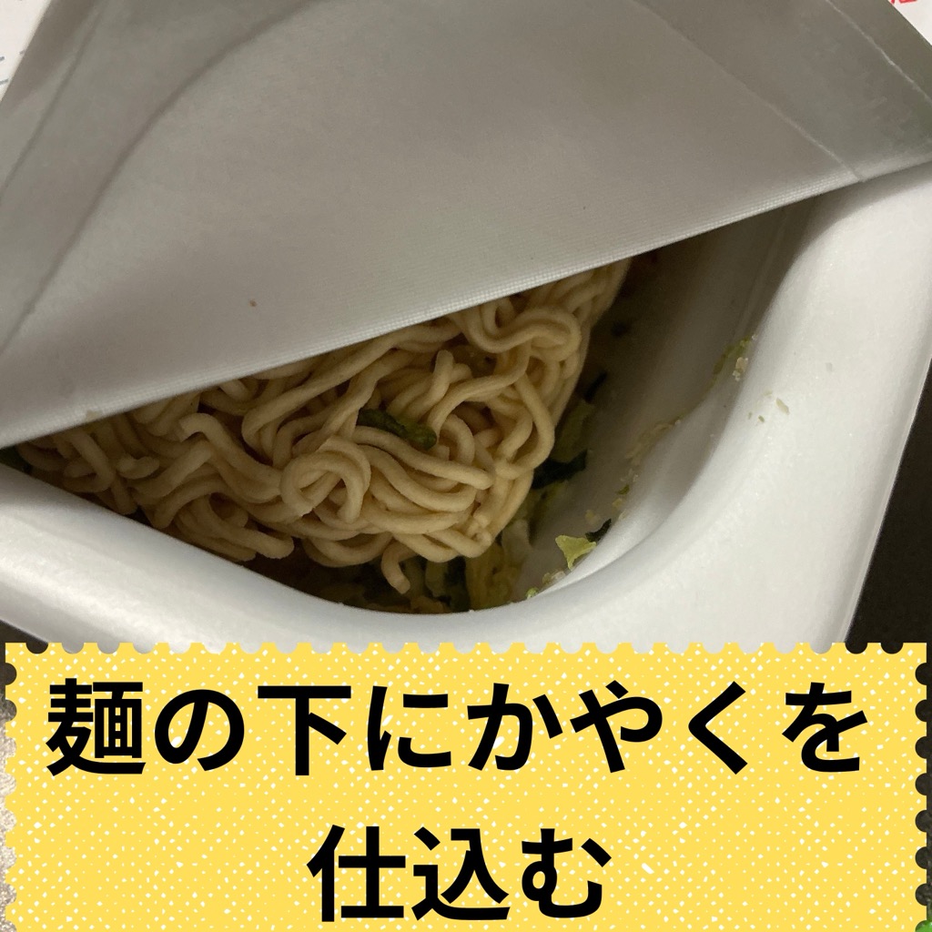 容器と麺の隙間から麺の下に「乾燥かやく」を入れます(ここ重要)